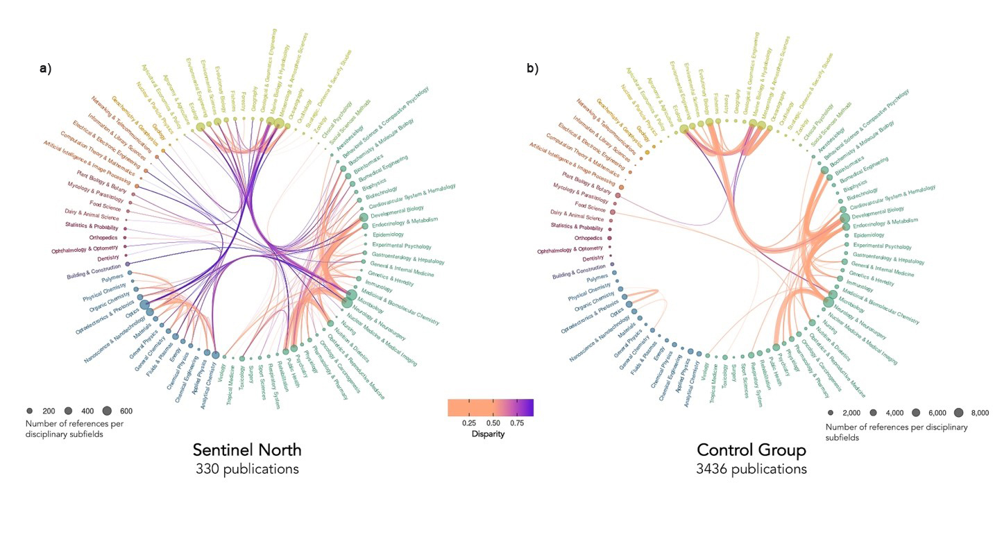 A key objective of the SN program is to promote the integration of knowledge, methods and expertise from different disciplines to catalyze scientific discovery and innovation in support of sustainable health and development in the North. This preliminary bibliometric assessment and novel visualization approach effectively captures the exceptional performances of SN research teams in achieving much higher interdisciplinary integration in their papers compared with those from the control set. How this interdisciplinary integration drives research impacts will be the focus of future work.