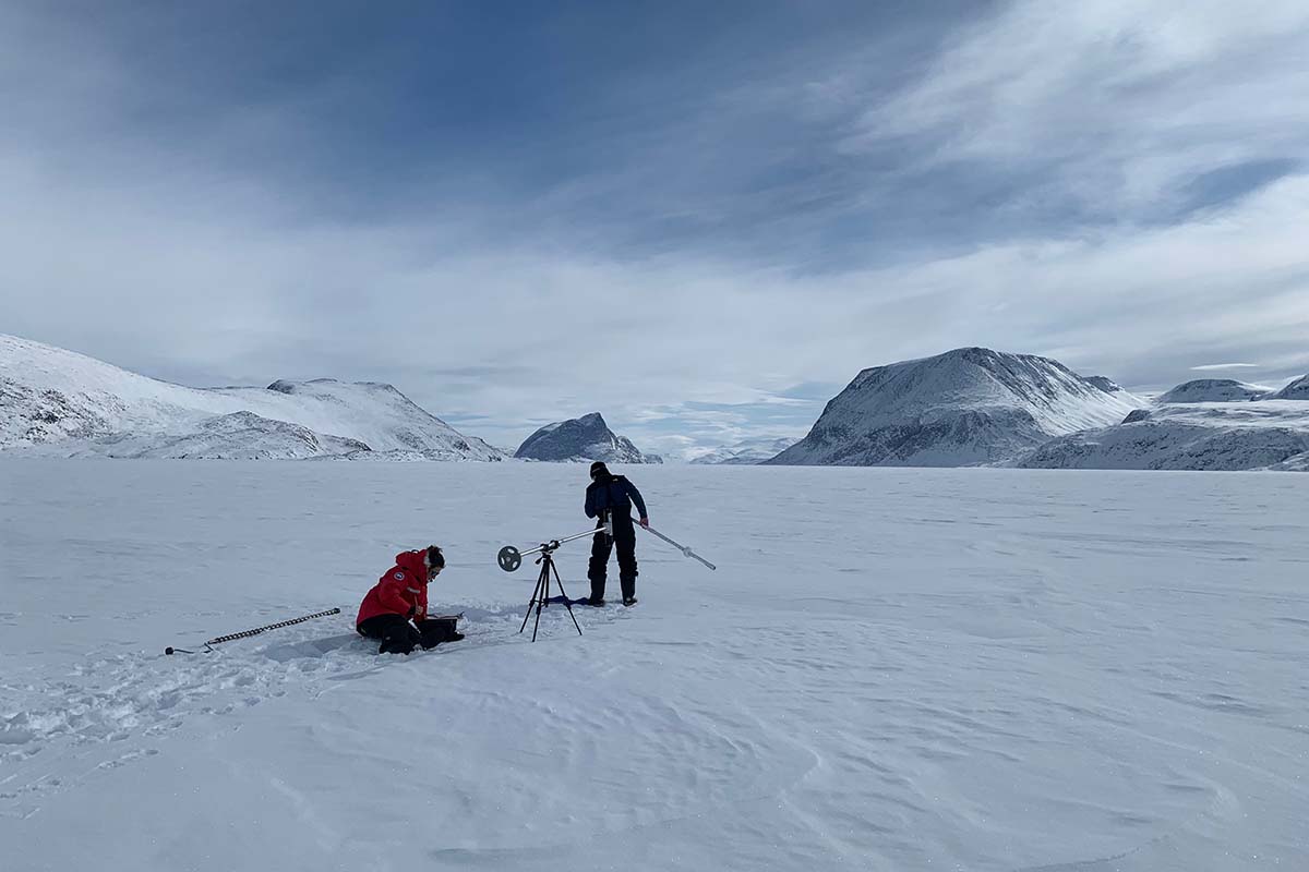 To address this challenge, the QikIce 2023 mission, which took place near Qikiqtarjuaq, Nunavut, from 19 April to 3 May and led by Marcel Babin, employed a combination of established and cutting-edge techniques. The Takuvik International Research Laboratory developed new endoscopic techniques that are less disruptive and allow in-situ measurements directly on the icepack. The mission had two focuses. The first focus was on the optical properties of the ice-snow pack. Classical radiometers were used to measure the reflectance and transmittance of the sea-ice pack (GB, RL, CP, BR). In addition, sea-ice endoscope techniques were developed to measure in-ice tridimensional photon fluxes using a calibrated 360 camera (RL, BR), and the scattering properties of the ice were measured using a diffuse reflectance probe (CP). Absorption coefficients were measured by filtering the contents of ice cores to observe their particulate and dissolved colored matter content (BR, MHF, JF, GB, BLH). The microstructure of the ice pack was also examined. Several snowpits were made to study the different layers of snow and the crystals composing them (BR). The crystallography of the ice was also studied by taking advantage of the natural birefringence of the sea ice (RL).